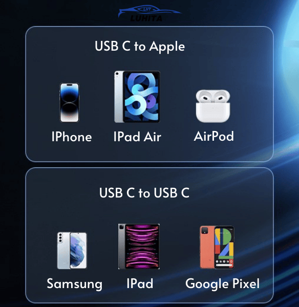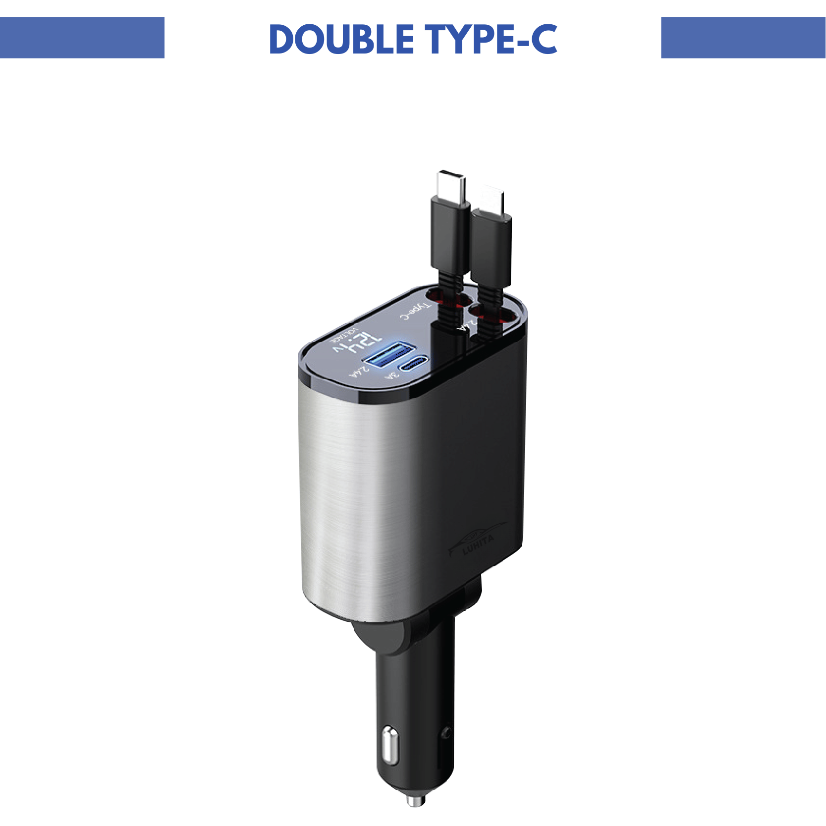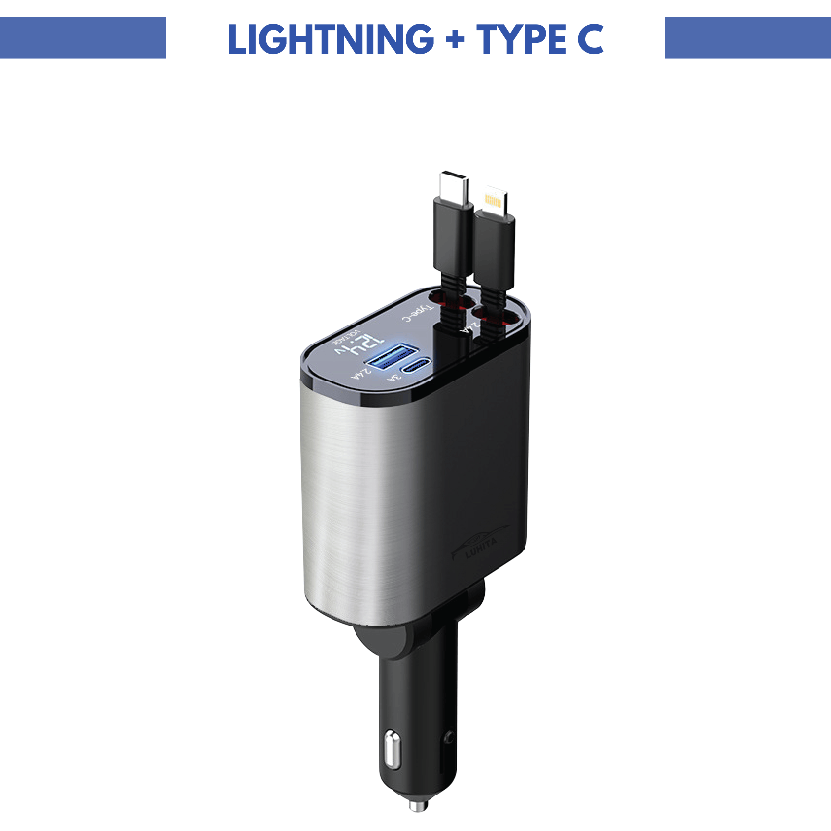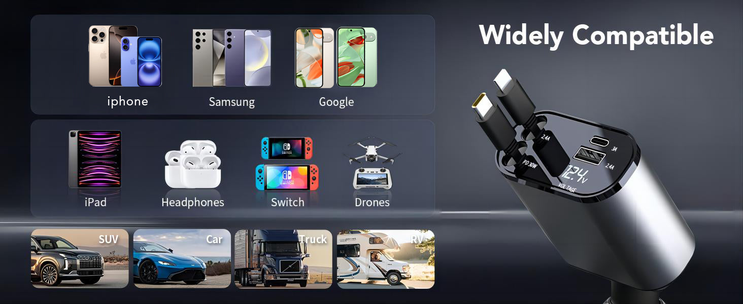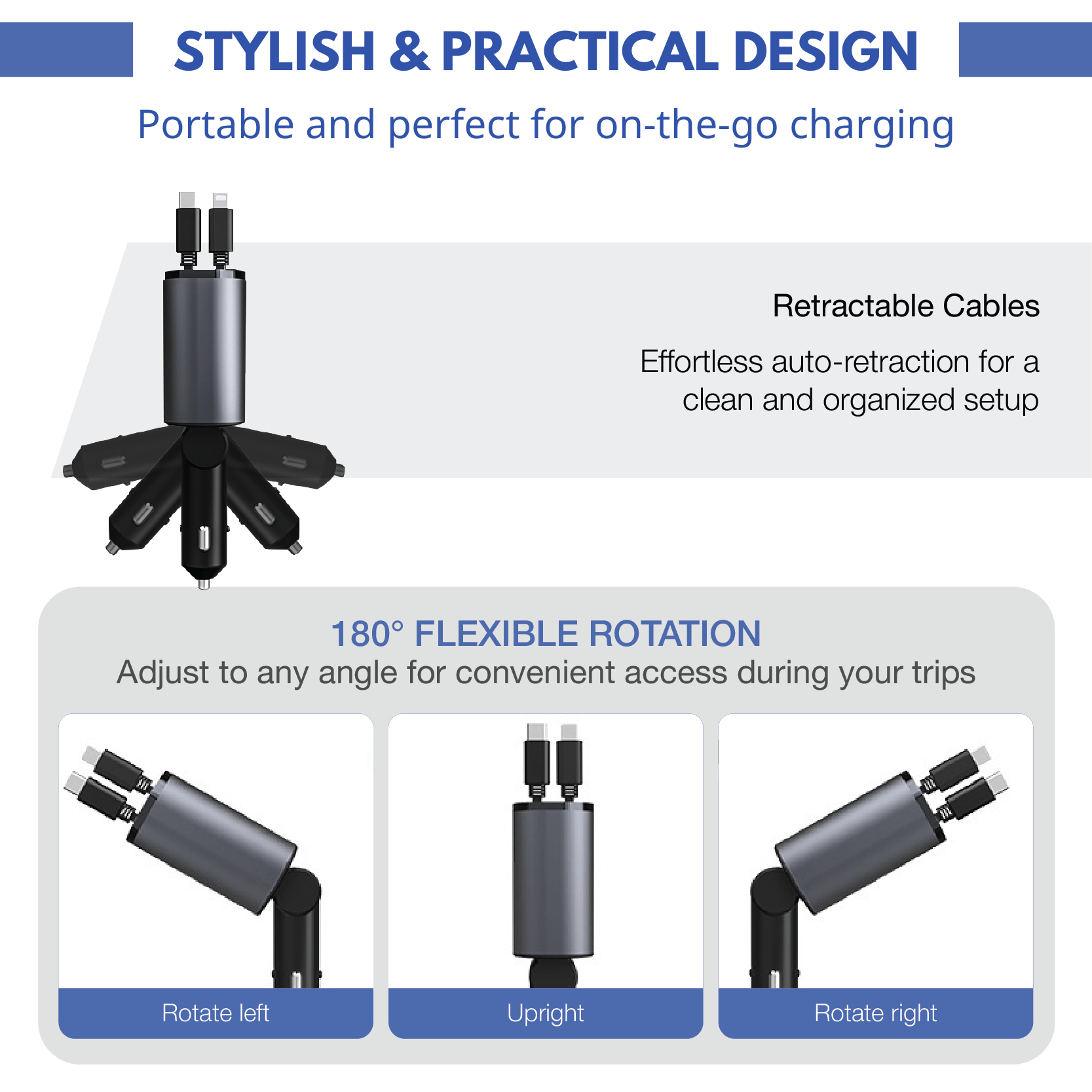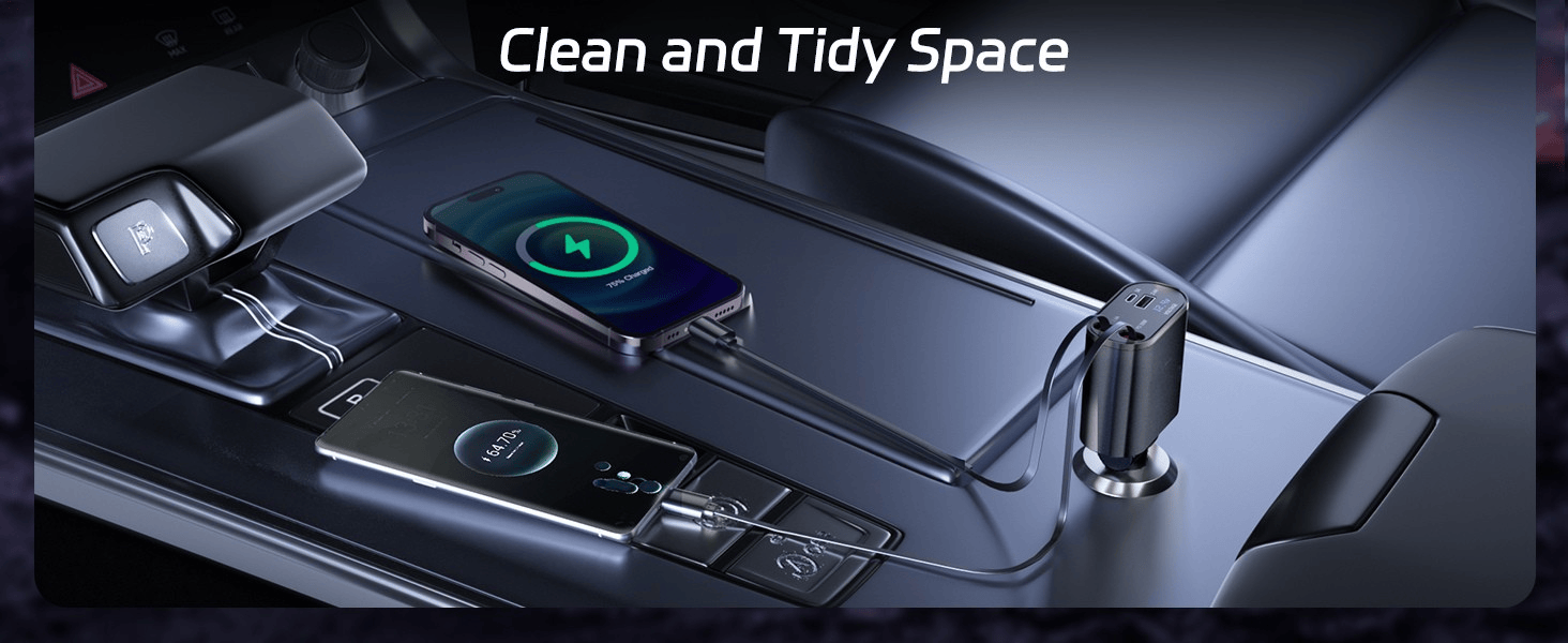 Includes Apple and Type-C retractable cables, keeping your car clutter-free and ready for any device. Perfect for the modern tech lifestyle.