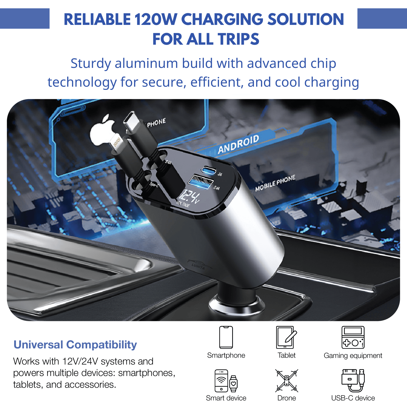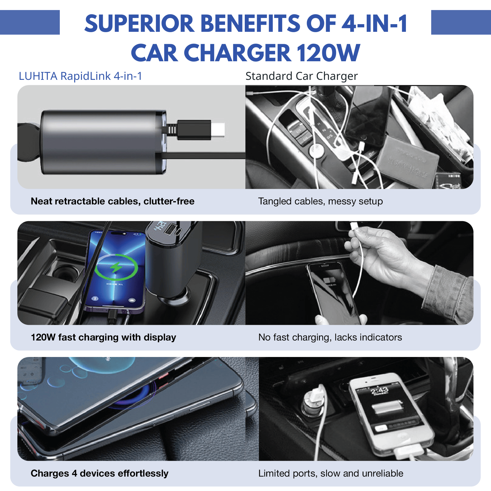 Absolutely! The LUHITA 4-in-1 Car Charger Adapter provides 120W fast charging with QC3.0 and PD technology, ensuring your devices charge quickly and efficiently. This is especially useful when you’re in a rush or need multiple devices powered up.