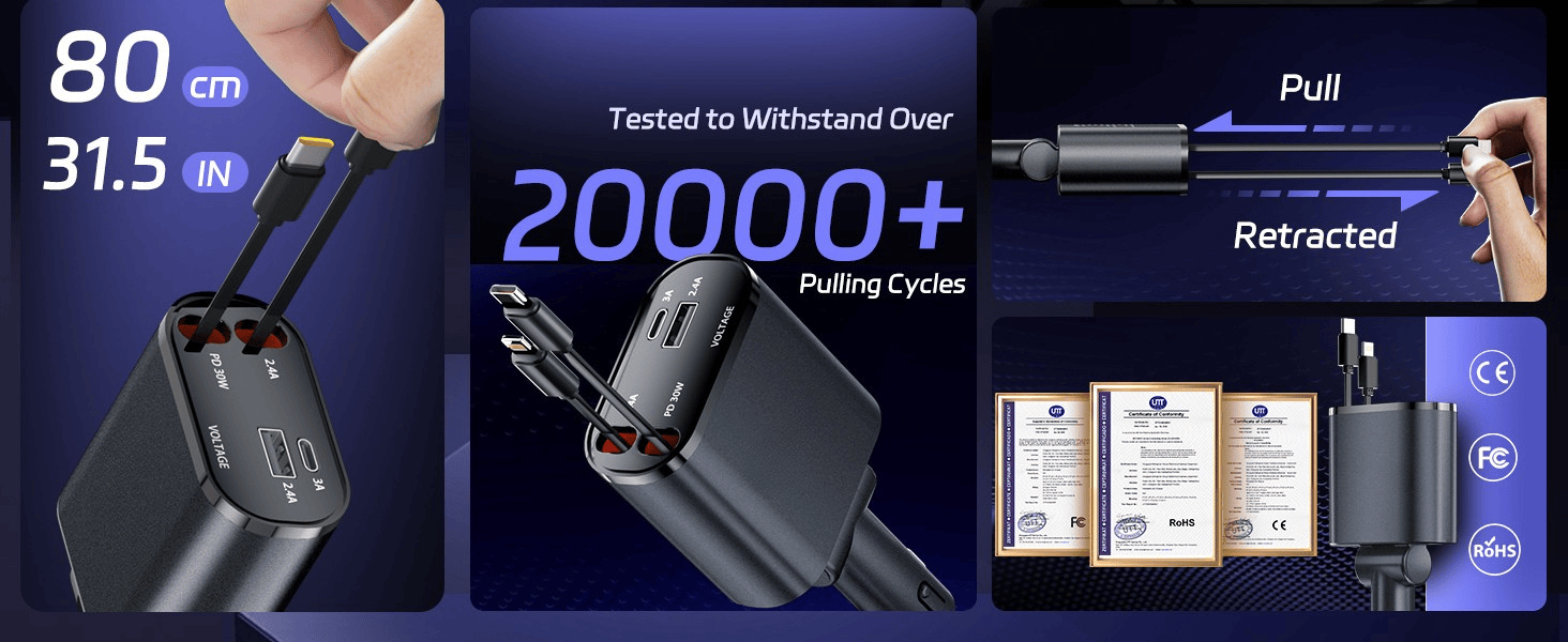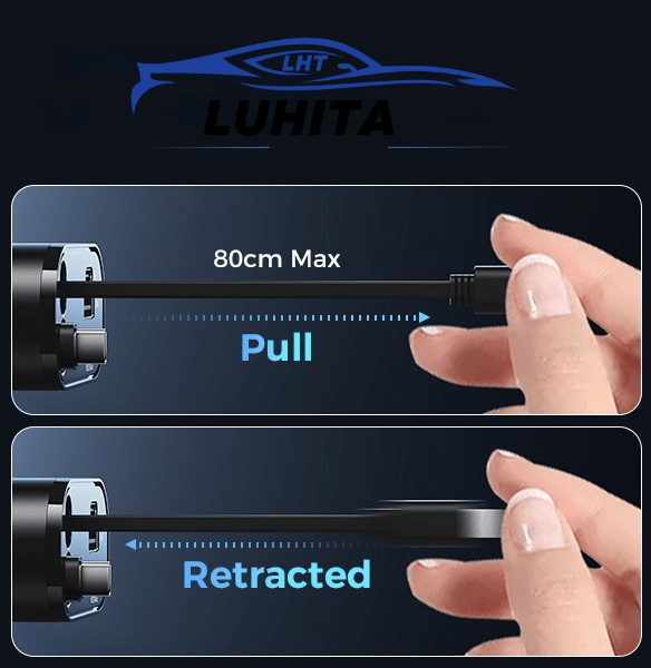 The retractable cables extend up to 80cm (2.6 ft) and retract automatically to keep your car tidy and free from cable clutter. Simply pull the cables out to the desired length, and when finished, they retract smoothly for convenient storage.