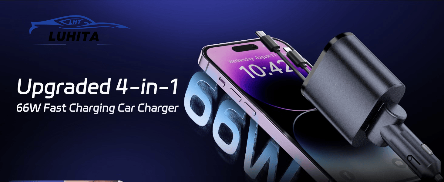 You can charge up to four devices simultaneously with the LUHITA 4-in-1 Car Charger Adapter. It’s equipped with dual USB ports and retractable cables, making it perfect for families or multi-device users on the go.